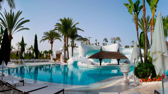 Formado por 71 habitaciones completamente equipadas, el hotel se caracteriza por su exquisito y refinado gusto. En los jardines que envuelven el recinto te encontrarás con piezas arquitectónicas que siguen la tendencia árabe-andaluza o cabañas al más puro estilo caribeño. Una piscina con un recorrido de cascadas, de grutas y de hamacas harán que tu baño en la época de verano sea algo más que un simple baño: sea un remanso de placer y exquisitez única.